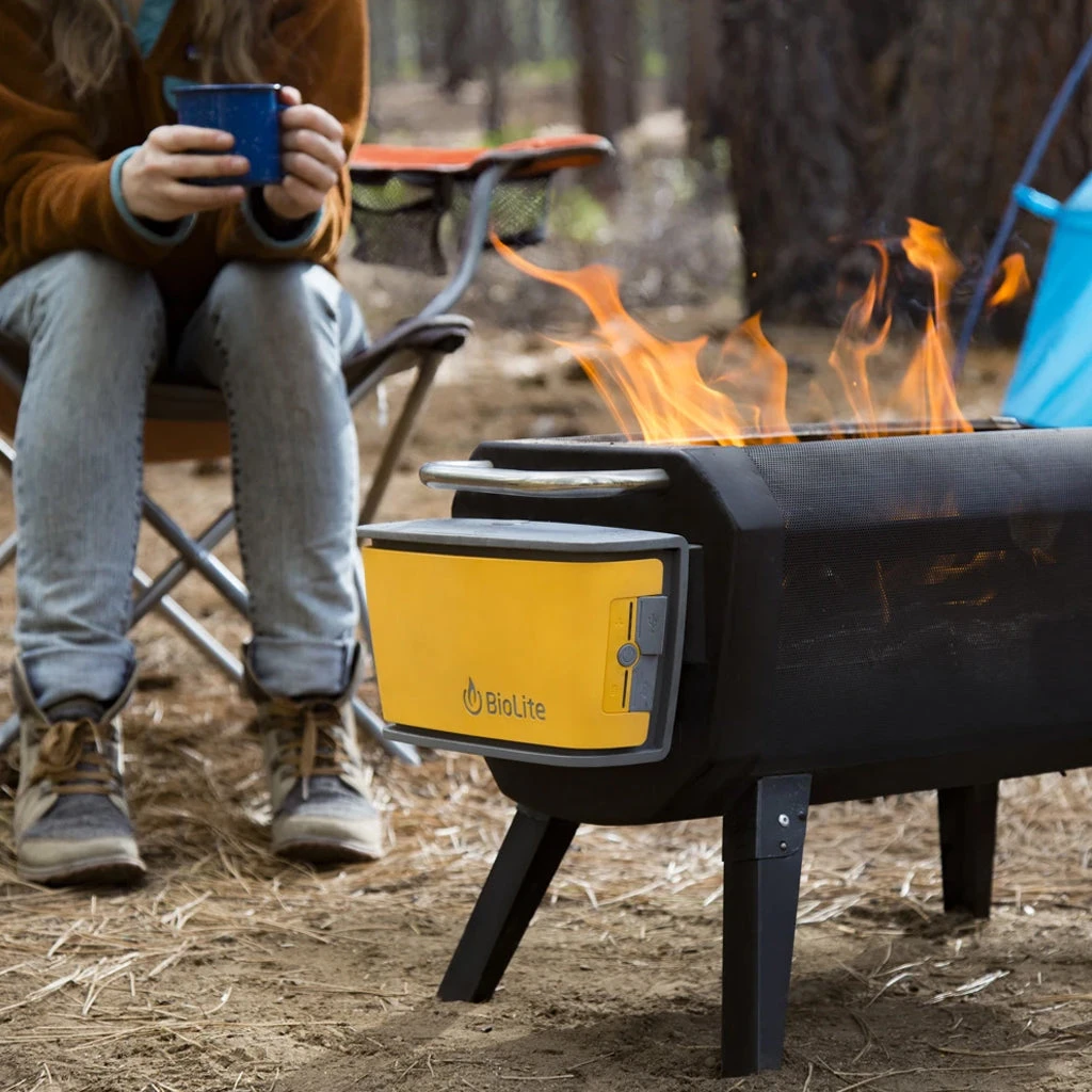 With capacity for up to 4 standard firewood logs, the BioLite FirePit creates hyper-efficient flames with patented airflow technology and gives you a front-row seat to the magic thanks to the X-Ray mesh body, enabling 360 views. Lift the fuel rack and toss in charcoal to transform it from a fire pit to a portable hibachi style grill, complete with an included grill grate. Control the size of your flames manually or remotely with the free Bluetooth app.