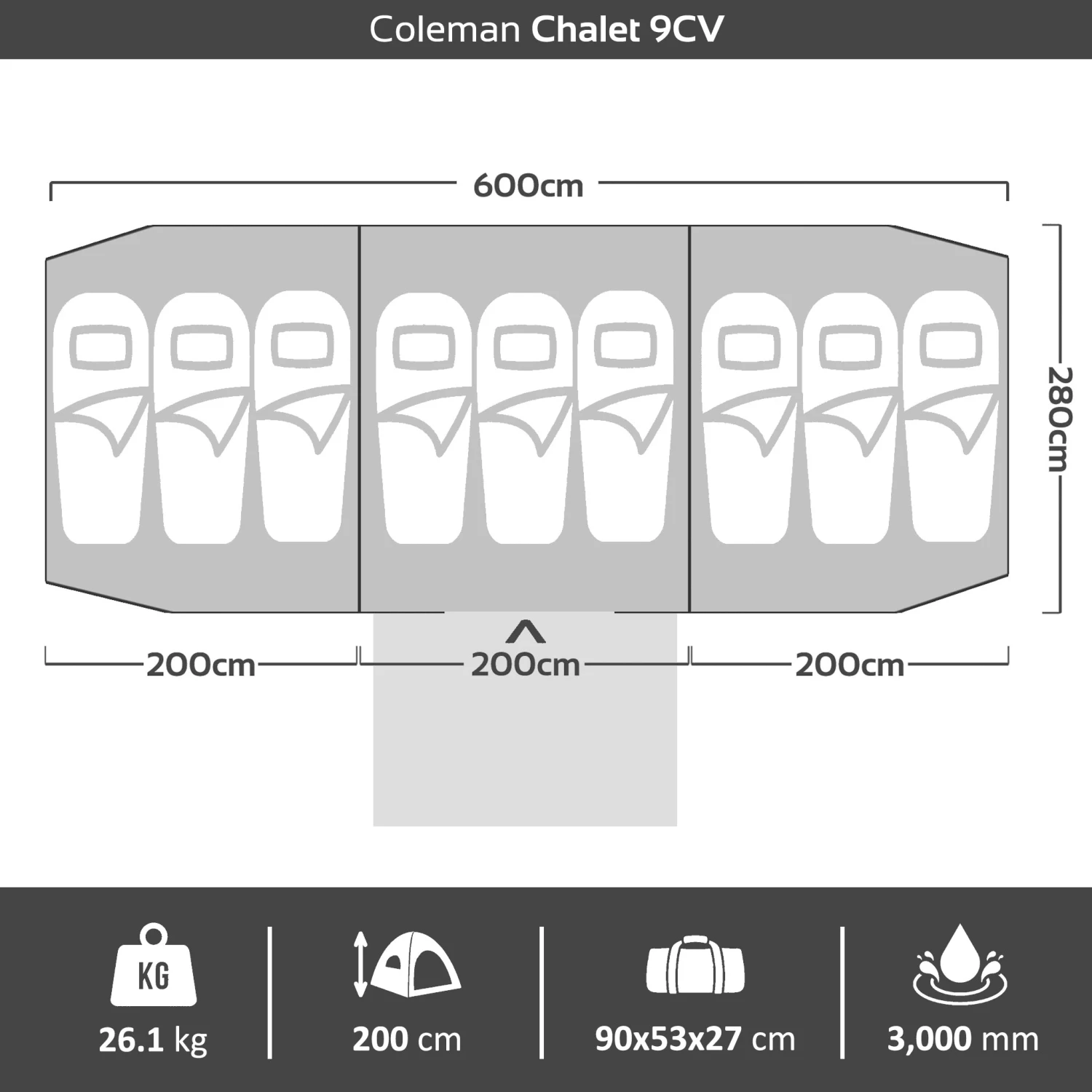 - Three room camping tent with fully sectioned bedrooms either side of the 200 x 280cm living area