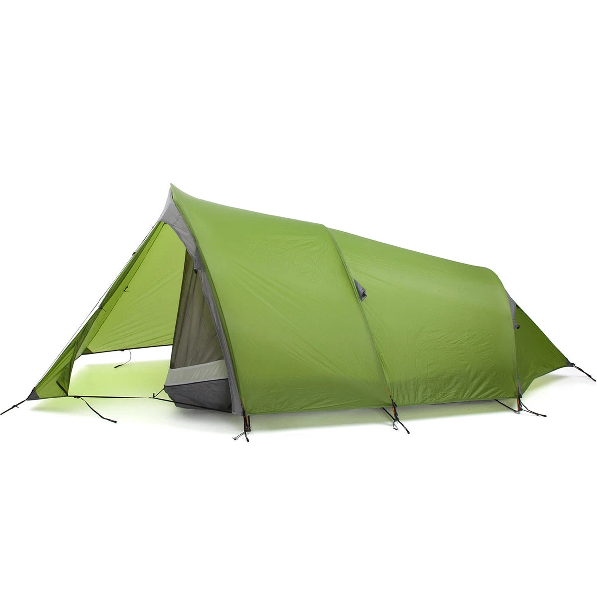 The tent is structurally designed for and should always be pegged out with maximum lengthwise tension. The precisely canted main and small pole arches transmit skin stress equally from the canopy to the front and rear vestibules. The outer tent zips exceed the strength of the fabric panels they join by many times. Operating the bottom sliders on the main zip leads immediately to the inner tent doors for convenient and independent double-sided access. The centre arch provides essential support and stability to the canopy in high winds and snowfall.