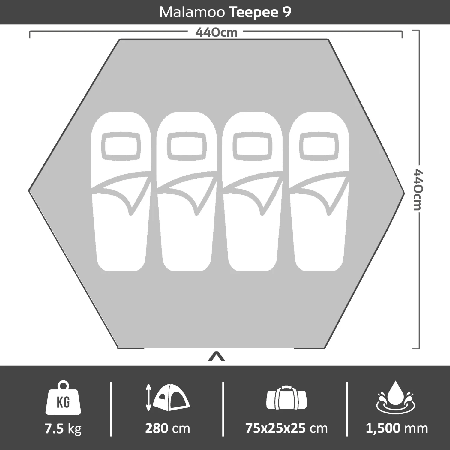 - 100% waterproof – We guarantee that all of our tents are 100% waterproof so you can sleep in peace. The Teepee 9 has a waterhead rating of 1500mm.