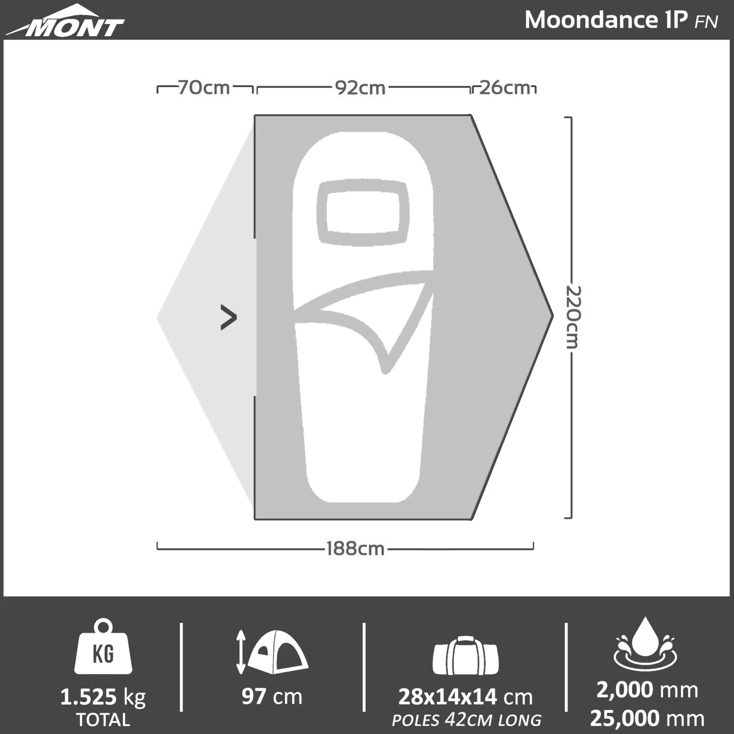 The Mont Moondance 1FN has 25% more internal floor area than the average 1 person tent. A 26cm wide 220cm long triangular expansion opposite the doorway provides waterproof internal space for your clothes, pack & accessories. Totalling 2.31m2 of internal floor space makes the Moondance 1 an incredibly spacious 1 person tent. Steep walls at either end and a wide ridge pole across the roof provide a spacious interior ideal for waiting out poor weather in comfort.
