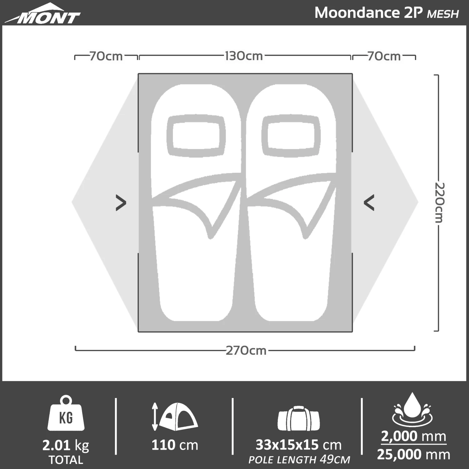 The Mont Moondance 2 Tent has been designed to provide you with 3 season weather protection, lightening fast setup, minimum packed size and the lowest possible weight without sacrificing performance. The new Moondance 2 Tent is the best lightweight, 2 person tent for hikers, bikers and adventure travellers in 3 seasons.