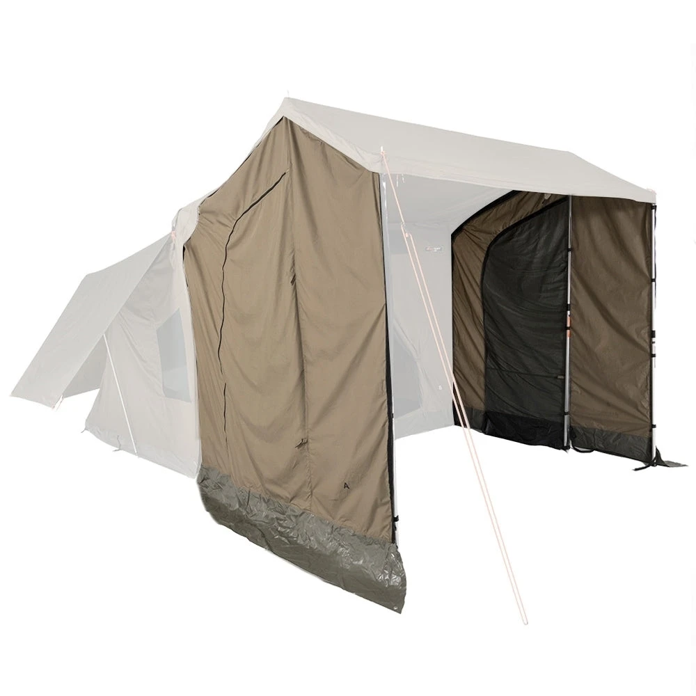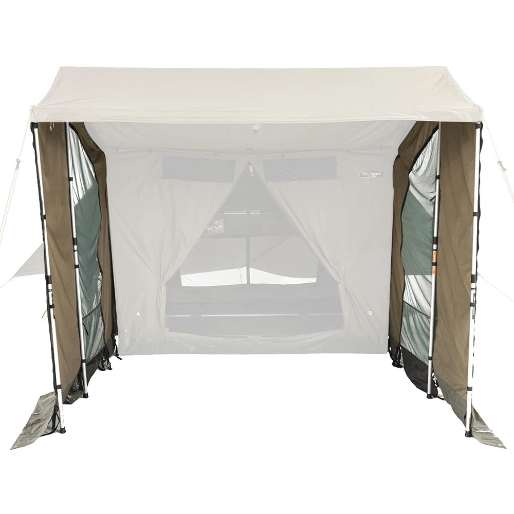 They simply and easily zip to the awning and side of the tent. They are made from the same waterproof Ripstop Polycotton Canvas as the tent. The Peaked Side Panels also have a zippered canvas door and a zippered superfine mesh screen door in each side.