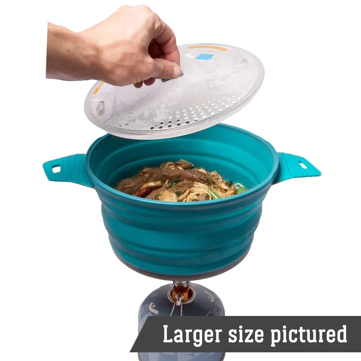 - Silicone handles secure the lid to the pot for transport.