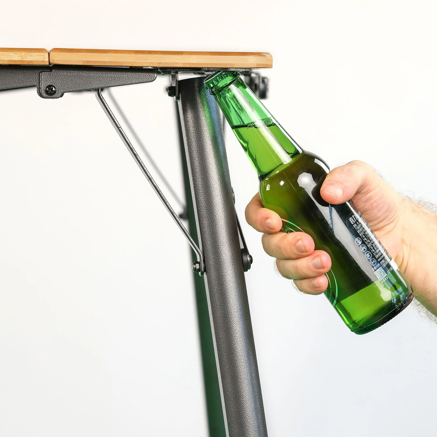 Once you’re sitting down comfortably at this table, you won’t have to get up to crack open a bevvie as it comes with a bottle opener built-in. When it’s time to pack up, it folds down small and packs easily into a carry bag for simple transport and storage.