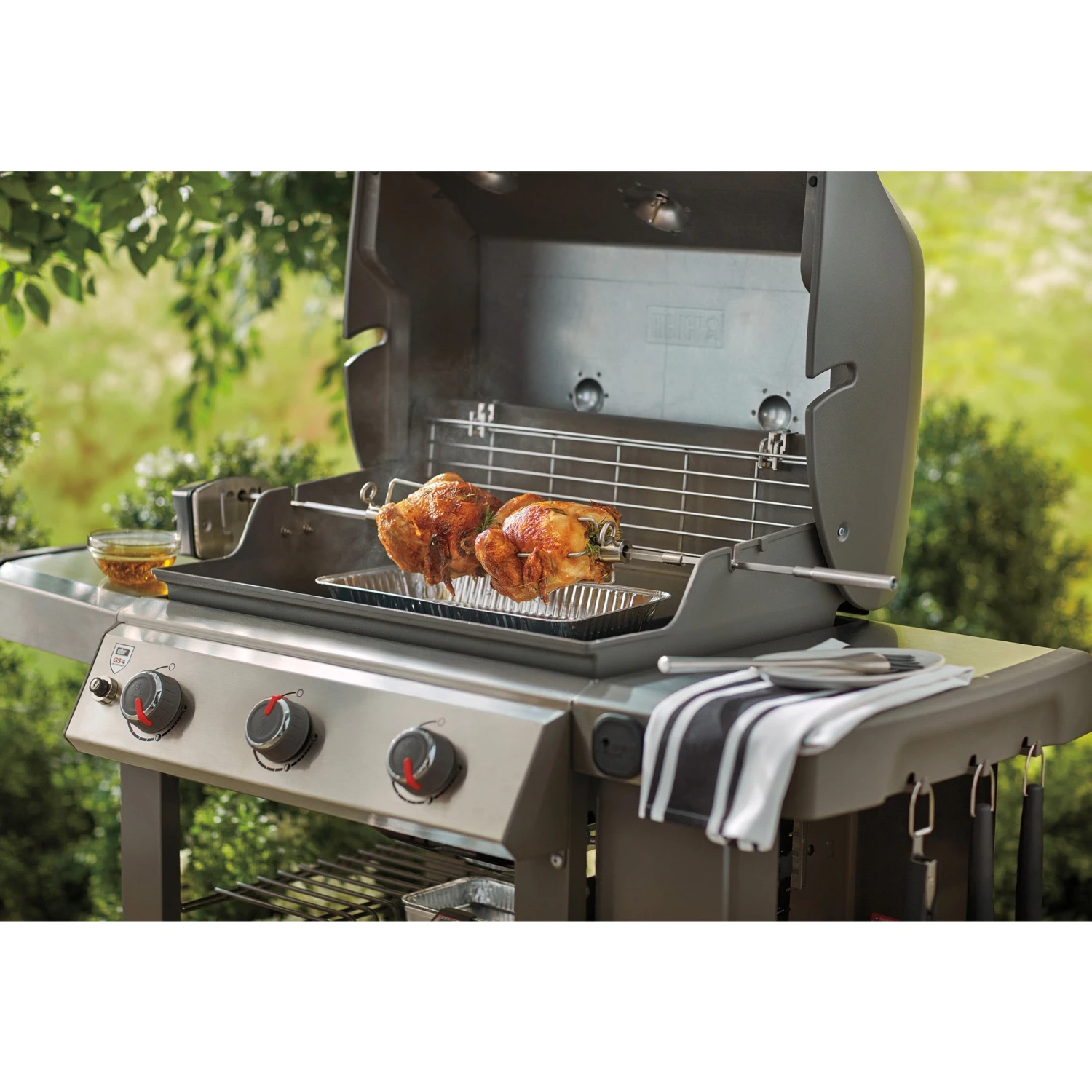 Take your repertoire to a whole new level with a Weber Genesis II/LX rotisserie. Complete with a rotisserie spit and forks that can handle a chicken or large roast.