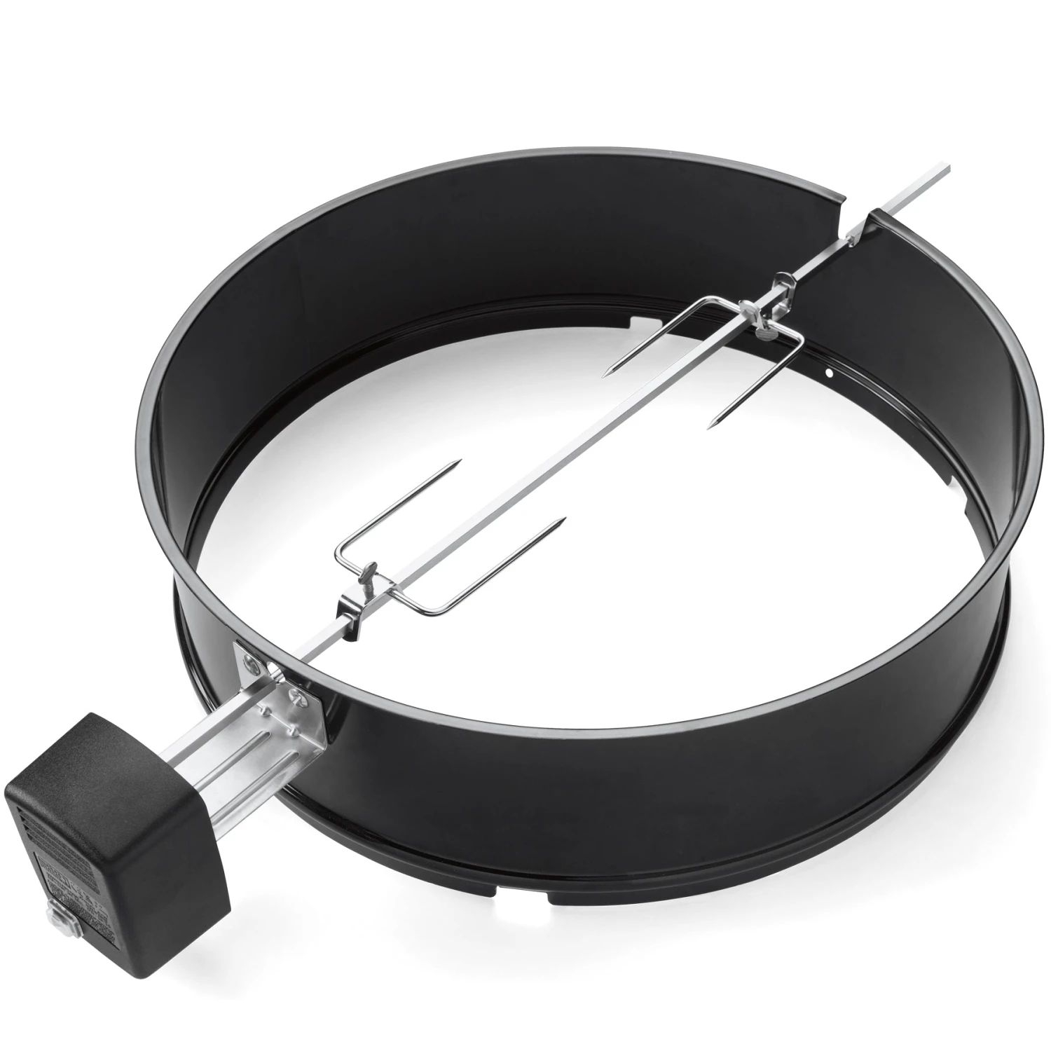 Take your repertoire to a whole new level with a Weber Kettle rotisserie. It comes complete with a rotisserie spit and two forks that can handle a whole chicken or large roast. This BBQ rotisserie is powered by a heavy duty electric motor to ensure smooth turning for even cooking all the way around.